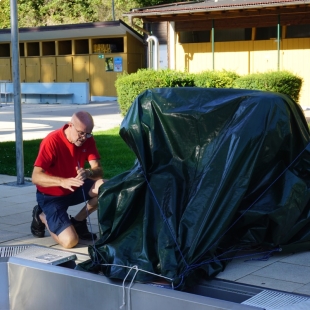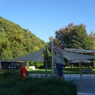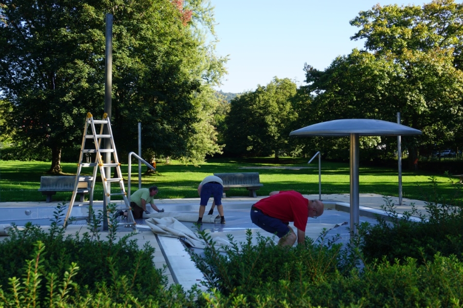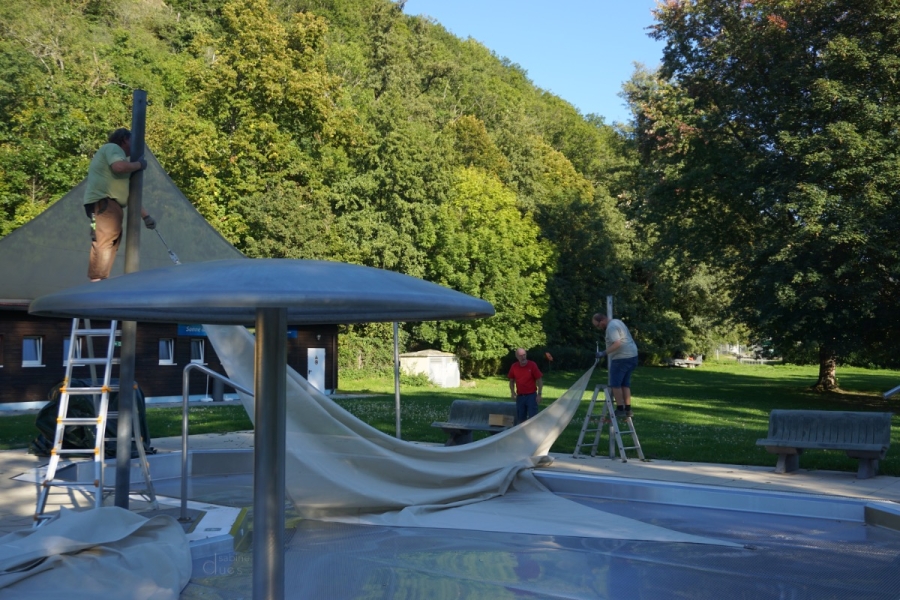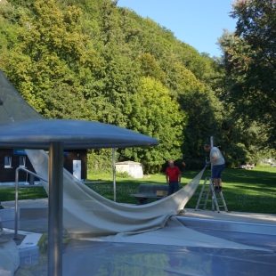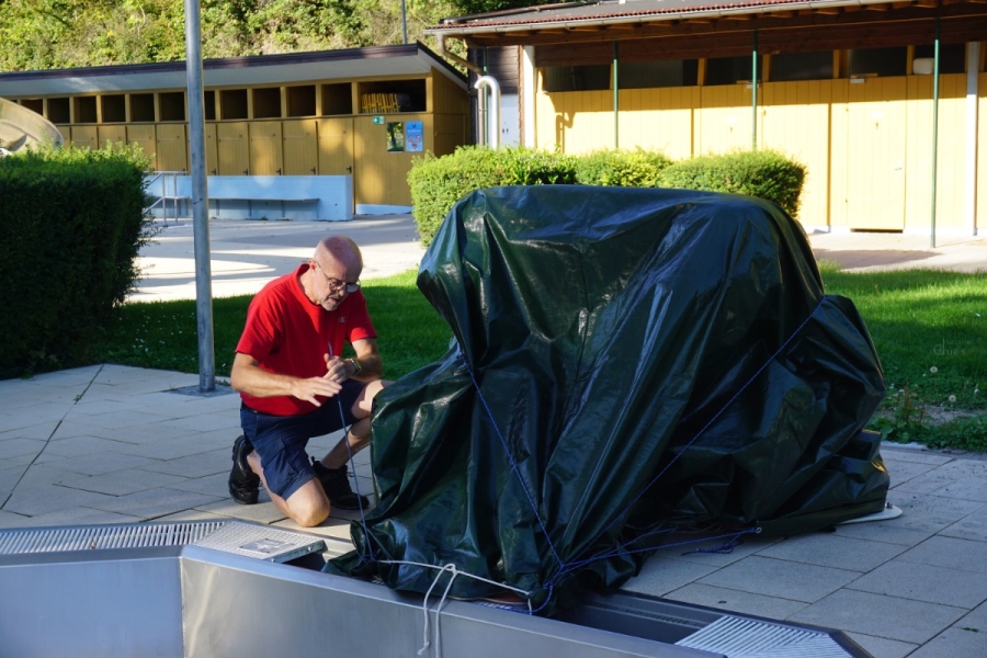 Am 19.09.2025 haben Willfried, Patrick und Claus-Dietmar die Sonnensegel über dem Sandplatz und dem Kinderbecken abgebaut und eingelagert, sowie die Delphinrutsche eingepackt. Sonja hat die Vorhänge aus den Umkleiden abgehängt und wird diese bis zur nächsten Saison waschen und bügeln.