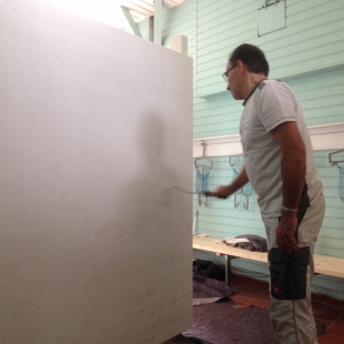 Die Holzwürmer des Vereins waren unterdessen damit beschäftigt die Trennwand vom neuen Behinderten -WC zur Damenumkleidekabine mit Holzpanelen zu beplanken und diverse Kontrollöffnungen zur Wasserinstallation einzubauen. Und da war noch die emsige Malerkolonne, die hoch auf den Gerüsten und Leitern dem kalten Wind trotzten und mit Farbe einen neuen Glanz in die alte Kabinenanlage brachte.