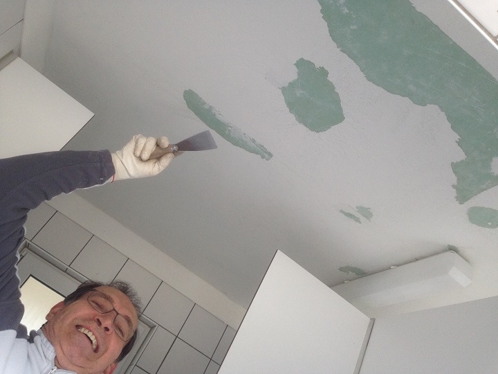 wir haben unser gestecktes Ziel erreicht. Verstaubt und mit müden Knochen konnten wir stolz gegen 14:00 Uhr auf unser Tageswerk blicken. Die Bodenfliesen wie auch die Wandfliesen waren entfernt, die Ver- und Entsorgungsleitungen freigelegt, der alte Wandputz zum größten Teil abgeschlagen. Ja und dann mussten die fleißigen Helfer von ihrem Capo förmlich zum Feierabend gedrängt werden, sonst hätten sie auch noch den gesamten Estrich in der zukünftigen Behindertentoilette herausgestemmt.